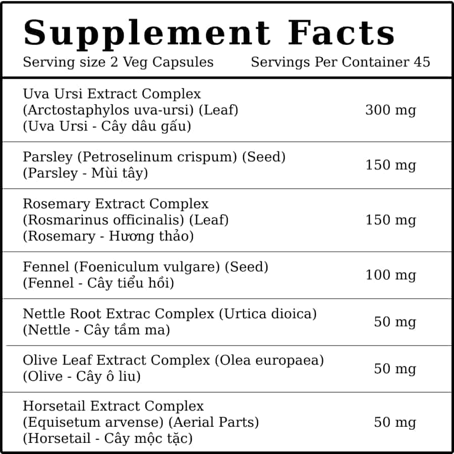 Thành phần: Uva-ursi, parsley, fennel, horsetail,…